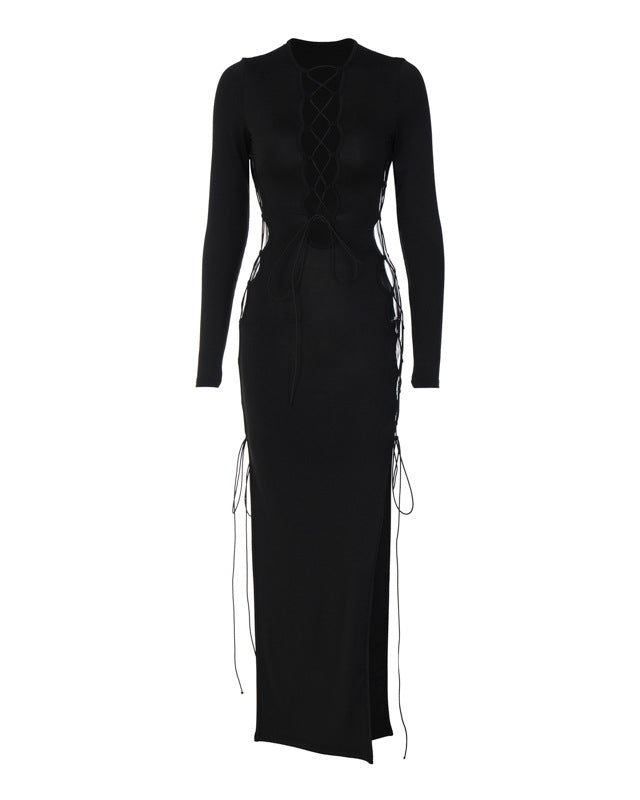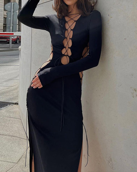 Hollow Lace-up Slim Slit Long Sleeve Dress