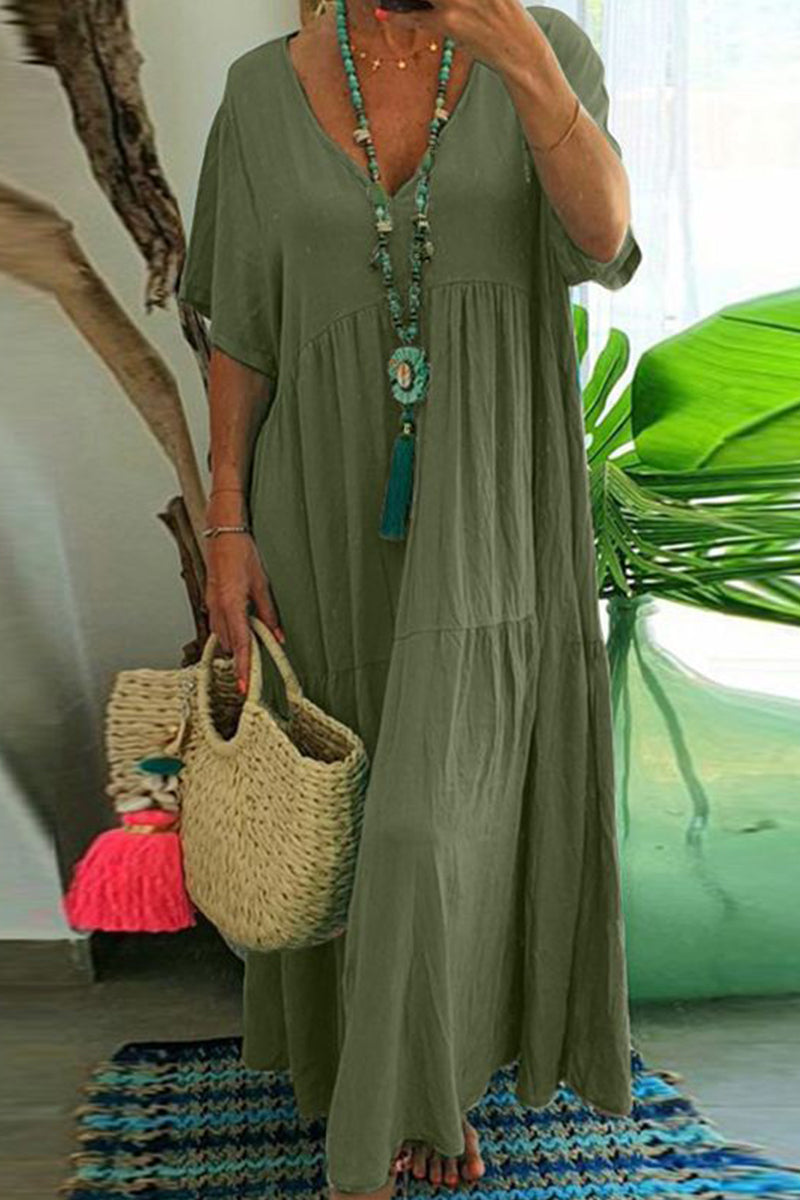 Plus Size Casual College Solid Asymmetrical V Neck Short Sleeve Dress(4 Colors)
