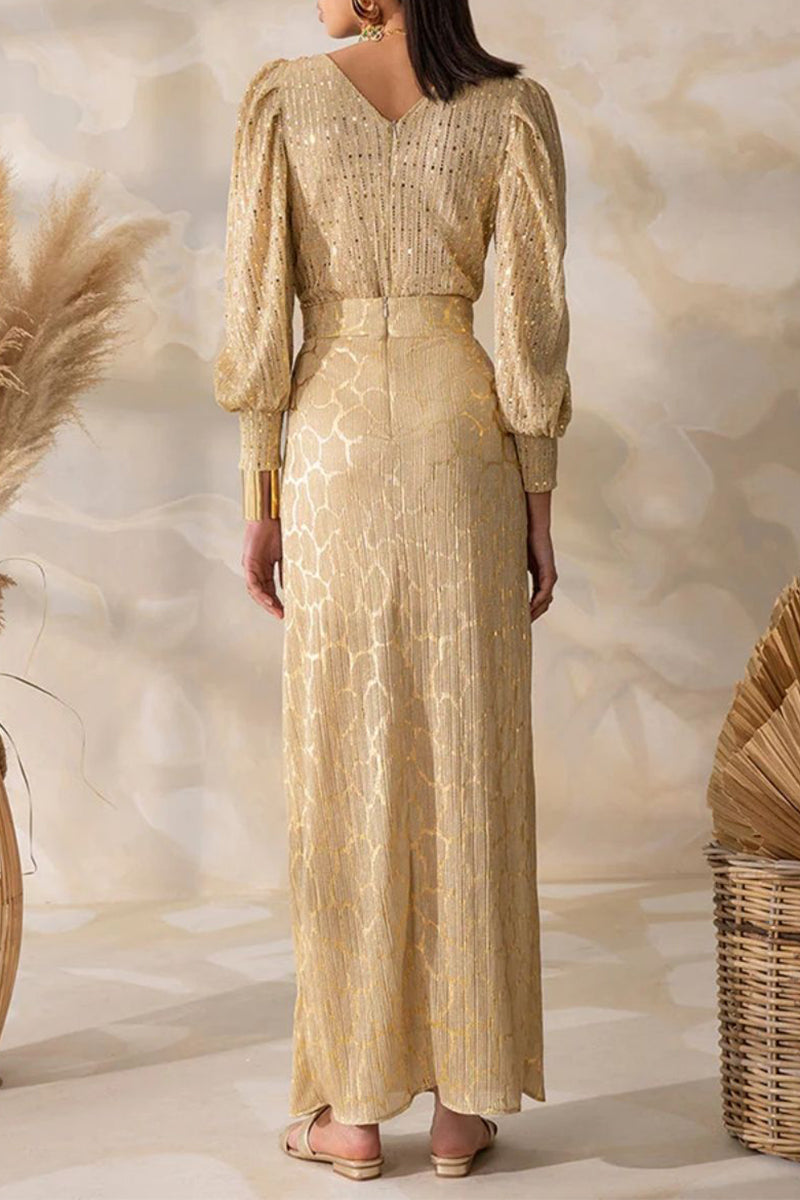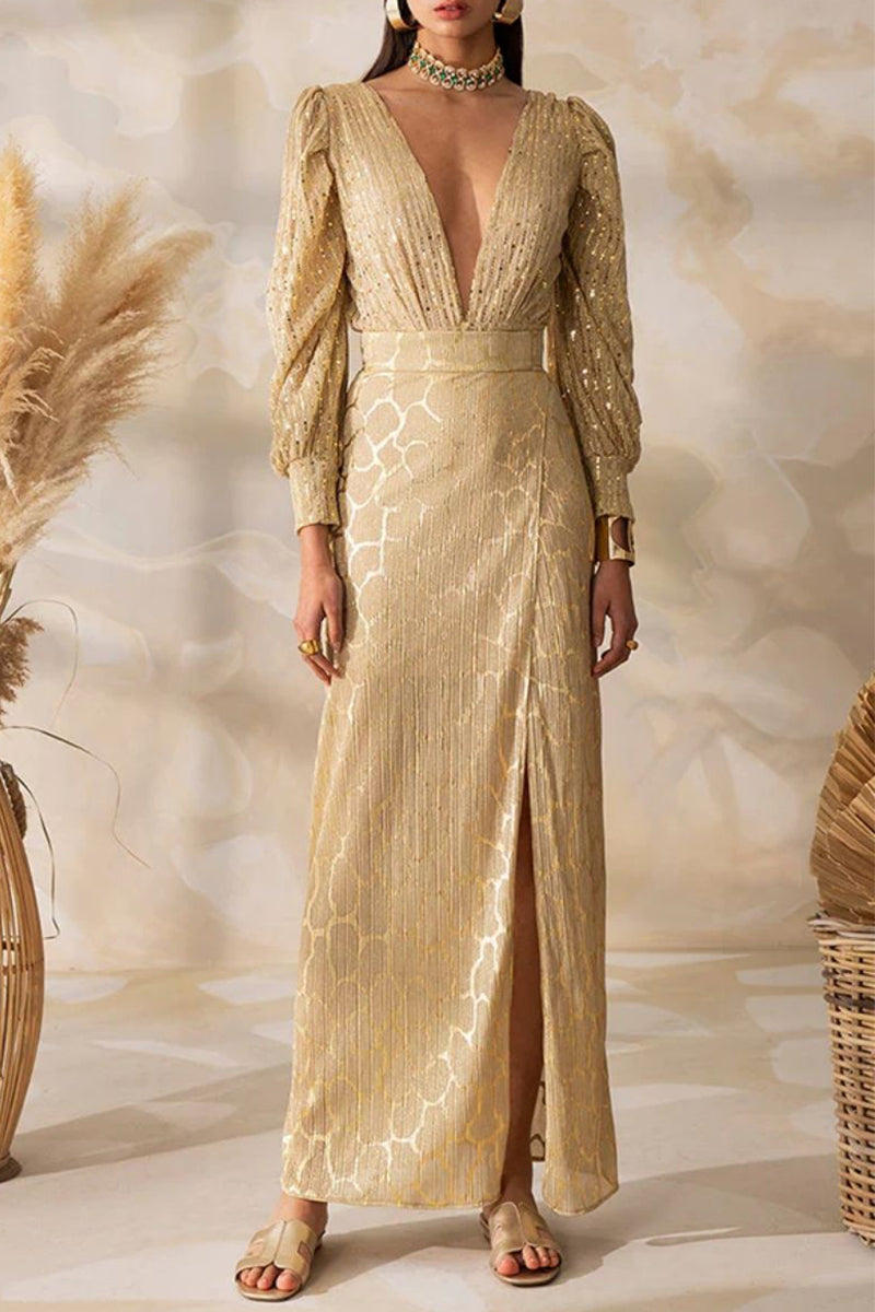 Sexy Print Slit V Neck Long Sleeve Two Pieces