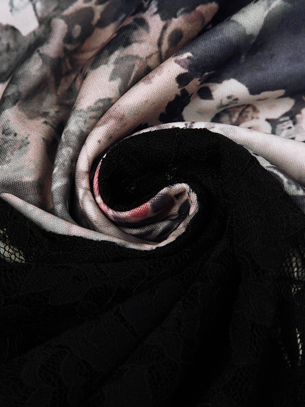 Vintage Dark Flower Print Splice Irregular Design Low Waist Midi Skirt